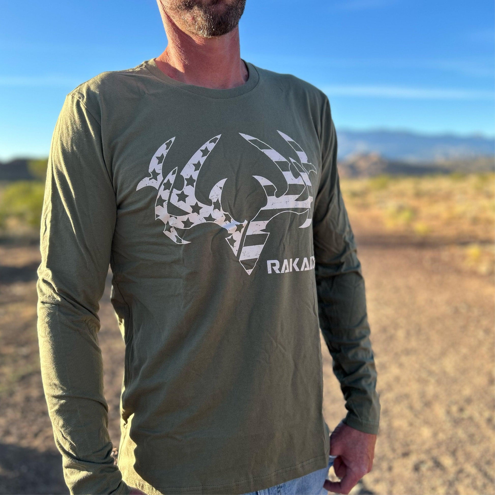 The Star Spangled Rak Long Sleeve is on a military green colored tee. It is form fitting and ultra comfortable. It is made out of 100% combed ring-spun cotton. For 3X sizes a comparable tee substitution will be made.